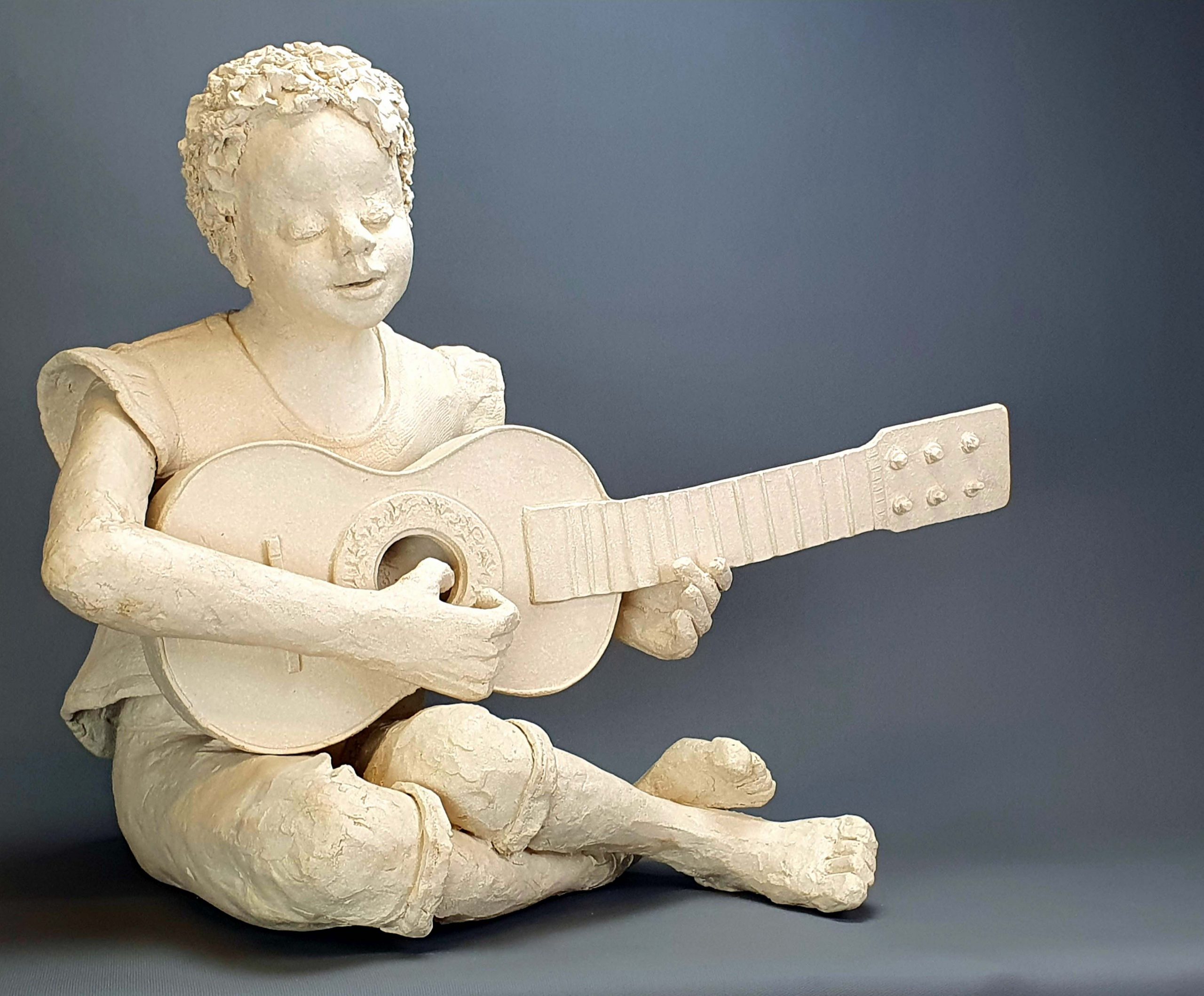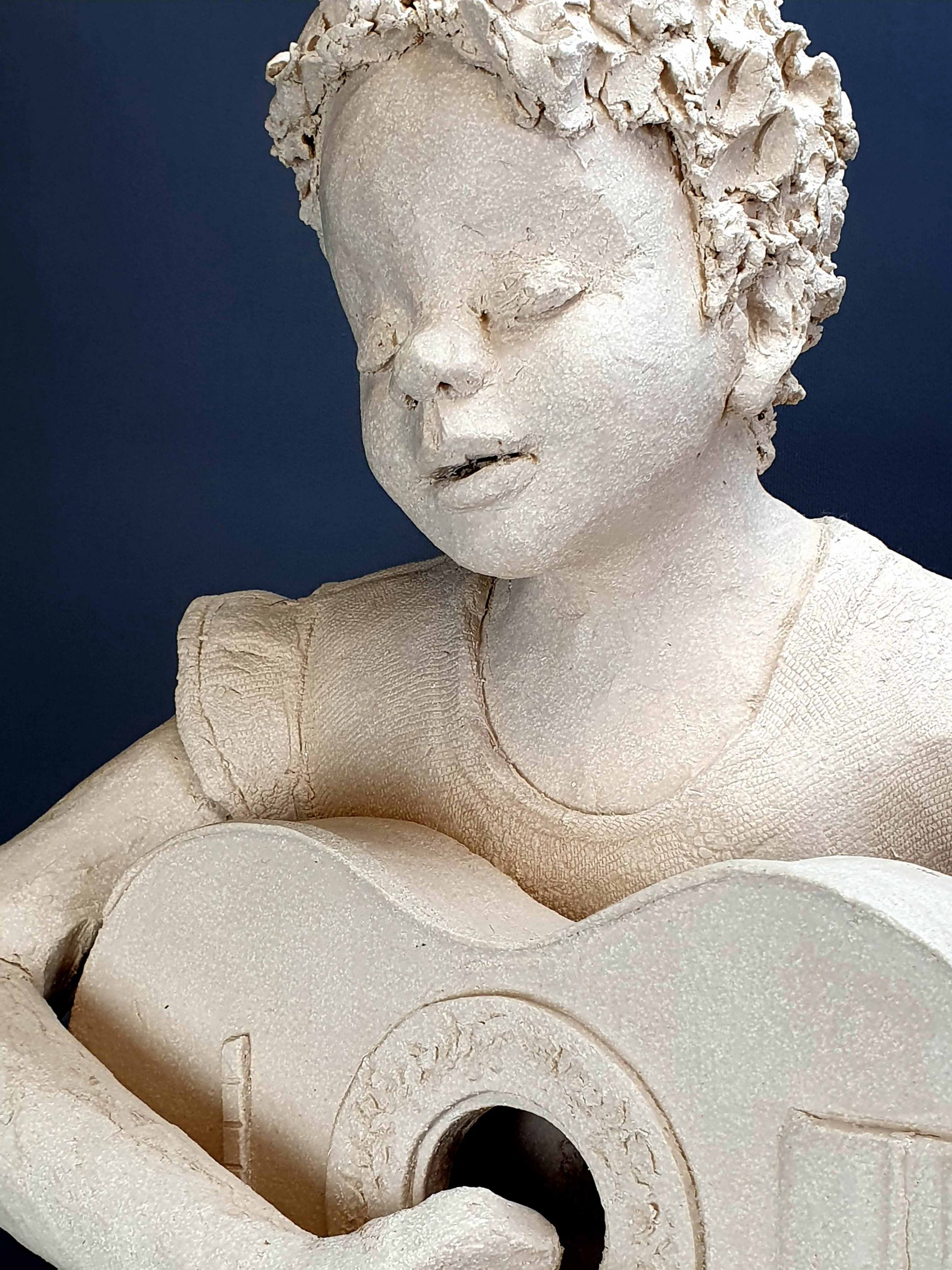 Sculpture en grès blanc d’une petite fille jouant de la guitare